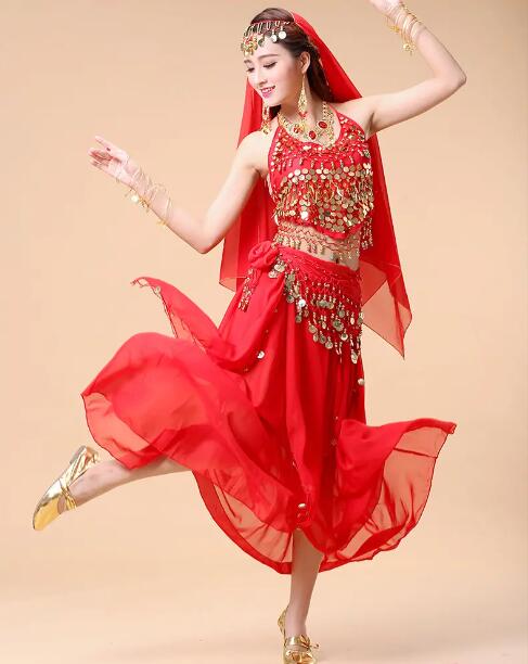 舞蹈演员和演员服装通常鲜艳夺目,会用各种首饰装饰,有的还会戴脚铃。古典舞的服装把舞者裹得紧紧的, 的腰也绷紧了 搭配灯笼形状的裤子,体现女性的妖娆身材。在当代,舞者经常穿着袒胸的衣服, 更能展现女性的魅力。舞者还会戴上与衣服相配的面纱, 有时会用纱布蒙住脸 兼顾了宗教因素, 则为舞蹈增添了神秘感。此外,舞者在表演印度传统舞蹈时不允许穿鞋, 以示对神灵的诚意。
