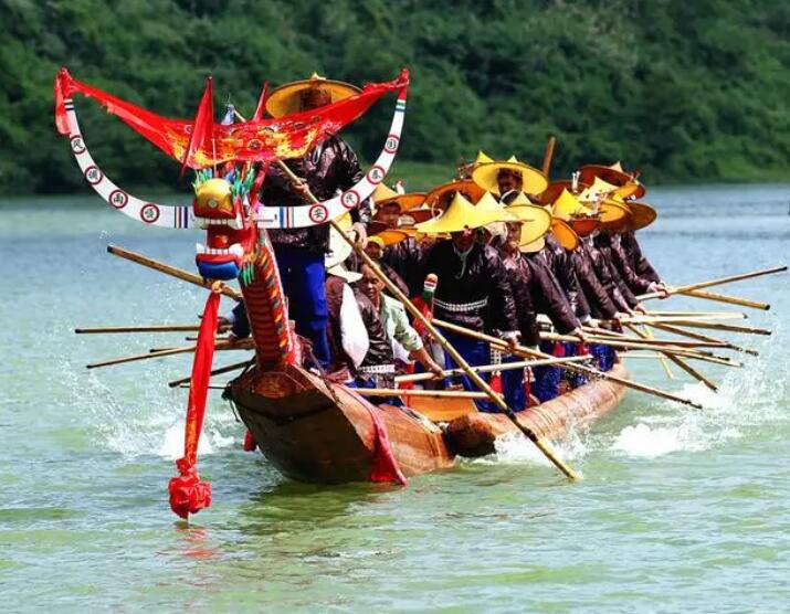以村为单位,一个寨子有一艘独木龙舟。如果没有龙舟的寨子想要建造独木舟龙舟,必须在龙年的十月底举行。制作龙舟的龙身由三个高体组成、笔直的挖成凹槽的大杉树并排绑在一起,龙的头颈弯曲成新月形状、质轻且韧、It 很容易雕刻,而且它 年代刻出了水柳树。木材选择挺拔、长势匀称好看、一棵枝叶繁茂且未遭雷击的大树。当选择山上的一棵树作为制作龙舟的木材时,您必须从山神那里购买这棵树,即在树根脚下掉落一元二角(在古代,留下了12个铜板)如果这棵树生在其他寨子的森林里,除了山神之外,整个寨子都必须买下它。