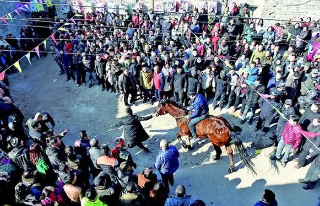 十点以后时钟,正式的赛马比赛将开始。八名骑手每个人都穿着毛巾和夹克,由一件毛皮大衣带领,携带官方文件和一个木制框架,上面写着“十万火急、速报京师”军情紧急、不得延误”等等,还会在木架上挂一串铃铛;第二匹马立即带着背包坐下,最后六匹是为了保护官方文件。跑马排”活动内容动作难度系数较大、高风险系数。参加赛马排排活动的马匹背上没有马鞍轴,腹部也没有踏板只有骑手坐在马背上,夹紧双腿,摇动缰绳才能驱使马匹驰骋。这样一个高难度高危险的动作,对于下东寨的百姓来说,就是一个小技能。为了防止跑步时滑倒,人们还特意在古巷道上撒了很多灰,马跑过时尘土飞扬,气氛非常好。无论你是青少年还是60岁的老人,你都可以骑上马,展示你的英雄姿态。娘子关里有句俗话“我宁愿熬夜也不愿错过赛马”赛马排排活动内容丰富多样,人数众多随着媒体在活动现场的大力宣传,赛马排兵布阵活动具有吸引力强传播面广的特点。方圆百里的人们在这一天都来这里看赛马,可以用人山人海来形容。当时间达到11 时,一年一度的赛马比赛正式结束,村里的锣鼓队和社火队再次表演,一直持续到下午2点左右。