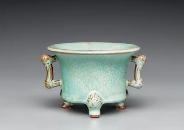 袁俊非常重视釉装饰,因为它可以 不要烧宋军的华丽色彩主要有两种方法:一种是铜含量高的釉粉不规则地涂在器物上,经高温还原后出现红色斑块。然而,这种红斑是不自然的和僵硬的,这与宋军 自然形成的蓝中带紫、紫中有红、浑身冒汗的风格很不一样,但也有一些精美的作品。另一种方法是使用堆叠和雕刻的方法,并利用釉料的流动来达到装饰效果。在袁俊,这堆雕刻图案中主要是莲花、兽面、龙头等,一般都装饰在器具的肩部。