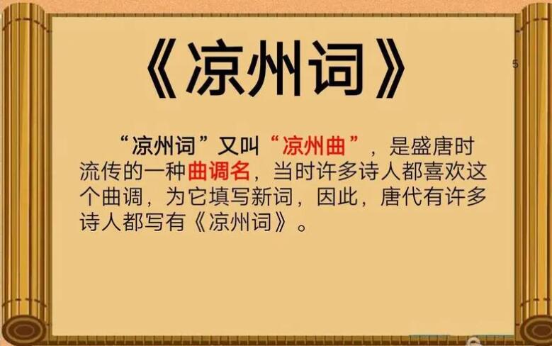凉州词(Liangzhou )又称凉州歌,是为凉州歌所作的一首抒情诗,是唐代流行的曲调之一名字中的凉州位于中国甘肃省武威市,因地处西部,常年寒冷而得名其代表作是《凉州词》。