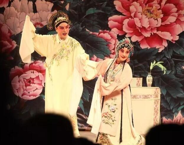 《牡丹亭·游园》男女主角穿着水袖跳舞、转身和背靠背的动作传达了他们的爱,同时在群舞的帮助下,生动地呈现了人物的内心感受和环境氛围。
