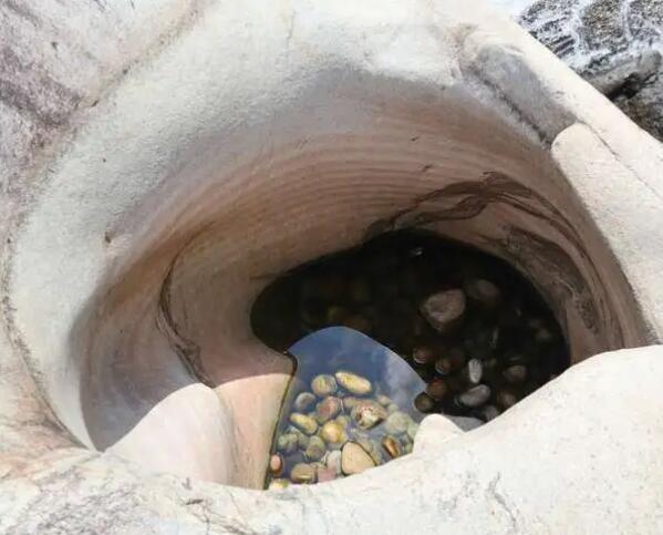2002年,摩根做了一个类似的实验,如右图所示:冰臼形态和假设水循环。水从左边进入、它向下流入螺旋槽,然后在中心突出的基岩周围循环几圈,从冰臼中间喷出。这表明水在冰臼中的循环是螺旋的,水体也从冰臼的中间通道排出。他发现洒水器垂直时产生的水流是直的而不是旋转的,所以他得出了结论:这种水流可以在瀑布下形成水池。他还发现,只有当水以一定角度流入冰臼壁时,才能在冰臼中产生旋转水流,该水流沿冰臼壁螺旋下降,在底部旋转并在中间再次上升。由于重力的影响,只有微小的颗粒才能被上升流提起。两位研究人员的实验表明,水中的砾石对岩石表面的磨损起着工具作用。在旋转过程中,砾石不仅自身被磨损和磨圆,还会影响旋转涡腔周围的基岩(包括漂砾)产生明显的磨损效果。如果巨石落入冰臼罐不要堵住冰嘴,它会掉进灰浆里变成新的“工具”2006年, Mikolajczyk还绘制了这种冰臼的形成过程示意图,这是冰下旋流的初始阶段、发展阶段、深化和提高类,那么冰臼已经形成。事实上,当冰川消退期到来时,这三个阶段同时存在。因此,在冰臼的发育区,你可以同时看到不同发育阶段的冰臼,从外观上看起来很颠簸、支离破碎。