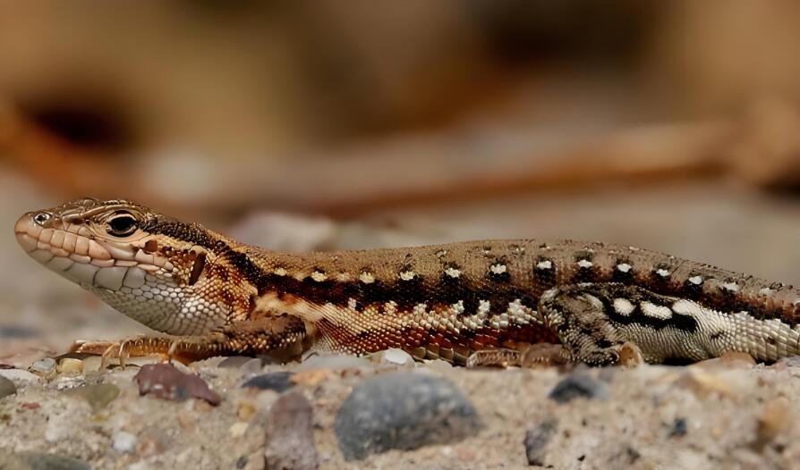 山地麻蜥,英文名:鄂尔多斯Racerunner,别名:麻蛇、四蛇、华北麻蜥、蛇蜥;它属于有鳞目、蜥蜴科和巨蜥科。它是一种小蜥蜴,身体和尾巴细长扁平。体长10~15厘米,尾长为头长的1.5倍。鼻尖长;额鳞2对,三角形;三个亚轨道鳞片延伸到唇鳞片,但没有达到口缘。背部黄褐色或浅褐色,背部和肋部有数排纵向排列的白色圆形斑点,圆形斑点周围有深褐色边缘;背部覆盖有突出的颗粒状鳞片。身体两侧各有一条深棕色的纵带;四肢五(指)趾,有爪;每侧有9~12个股窝,股窝间有6~8个鳞片。腹部黄白相间。除了基部的腹面,尾巴上覆盖着坚固的棱形鳞片。繁殖期雄性沿颈部至侧面有一条深红色的纵条纹,尾部基部明显比雌性粗。在生殖期,女性的腹部比男性更大。幼虫尾部为蓝灰色,一个月后随着年龄的增长逐渐变淡。