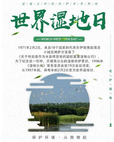 1996年10月湿地公约第19次常委会决定将每年2月2日定为世界湿地日,每年确定一个主题。利用这一天,政府机构、组织和公民可以采取大大小小的行动来提高公众对湿地价值和效益的认识。