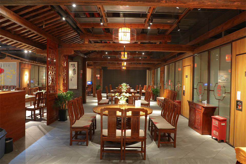 门店的装修风格均采用了传统的中式元素,古朴、典雅;结合陕西民俗,由“富平”地方名称的寓意而转化,与富饶平安的美好概念相融合;采用中国传统实木家具沉稳、大气;店内石刻部分如:石狮、牌坊、龙柱、栏板、铺地石等均采用富平上等的“墨玉”雕刻而成;店面大厅、包间的字画部分,融汇名家大师墨宝,以贴合陕西人文、店内风格的诗词、山水、歌赋等作品,使整体店面古朴、厚重、文化气息浓郁。