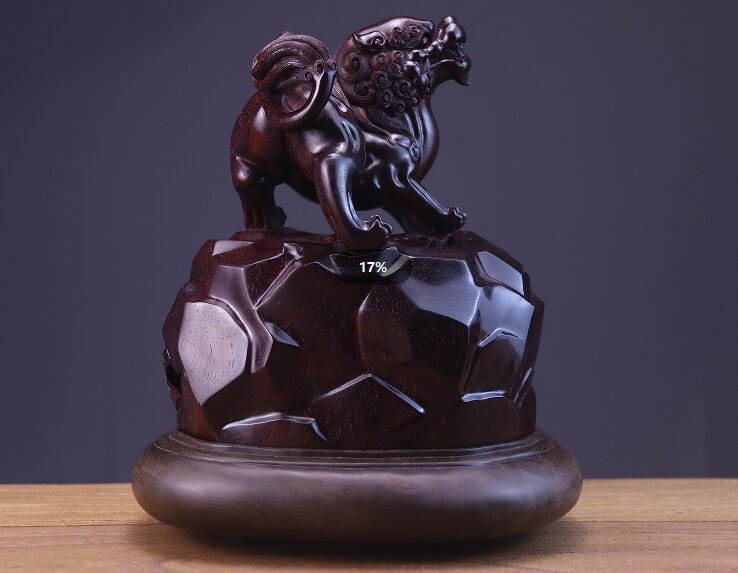 创作设计:狻猊香薰,作品分两部分,上为盖,下为底,盖由紫檀制,创作思路,利用材料的自然空洞做为香薰的烟道,上刻一尊昂首挺胸神兽狻猊,狻猊是中国古代神话中的神兽,也是龙生九子中的第五子,其形似狮,喜烟火,常被用来装饰在香炉上,也是佛或菩萨的坐骑,护法兽。揭开上盖,其下为底,底用金丝楠阴沉木制,水波纹理波光粼粼,上置防火棉,点盘香,整体意境表现甚佳,在佛教中供奉狻猊可以增加福报和功德。