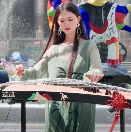 演出时,她常常身着汉服、头戴面纱,国风古韵与古筝相得益彰,仿佛从古代穿越而来的仙子。她用灵动的音符,将中国传统文化的故事娓娓道来,让外国友人在欣赏音乐的同时,也能感受到中国文化的博大精深。她因在法国街头演奏被官媒报道而迅速走红,成为了传播中国文化的使者。