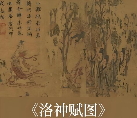 《洛神赋图》的文学蓝本是曹植的《洛神赋》。此赋创作于魏文帝黄初三年,曹植入京都洛阳,途经洛水时触景生情所作。它描述了一个人神相恋的感人故事,曹植在洛水之畔休息时,偶遇貌若天仙的神女,二人心生爱慕,然而人神殊途,最终只能含恨别离。赋中倾尽笔墨描写神女之美,不涉及外在具体人事,仅表现曹植当时的内心情绪感受,具有浓郁的抒情性质与瑰丽的神话色彩,辞藻华丽、想象丰富、如泣如诉,写尽了世间的无奈与遗恨。