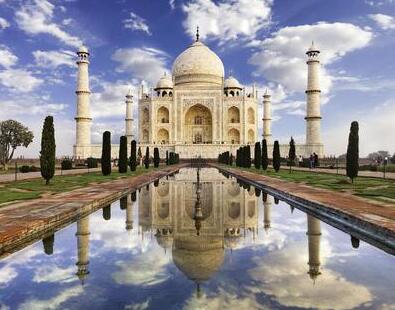 泰姬陵是印度莫卧儿王朝第五代君主沙杰罕为宠姬泰姬.玛哈尔修筑的陵墓,全部用白色大理石建成,主建筑四边各长5687米,穹顶高74米。这座伊斯兰风格的建筑外形端庄宏伟,无懈可击,寝宫门窗及围屏都用白色大理石镂雕成菱形带花边的小格,墙上用翡翠、水晶、玛瑙、红绿宝石镶嵌着色彩艳丽的藤蔓花朵。