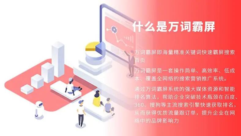 随着搜索引擎的不断发展,搜索引擎对内容的要求越来越高。万词霸屏就是将不同的内容以图片的形式展现在搜索引擎中,通过这样一种方式使网站吸引更多用户眼球。如果一个公司是做 SEO或者是网站优化,可以考虑在网站上放一些产品图片或者是视频资料等供用户直接观看。这是非常有效的推广方式。除了通过图片推广方式以外我们也可以使用 SEO工具进行万词霸屏,通过万词霸屏软件来对网站优化,利用万词霸屏软件将网站收录在百度等搜索引擎的首页上,并以此来提高网站广告客户的曝光度和增加流量。万词霸屏平台是国内最专业的搜索引擎优化平台,并且万词霸屏平台的优化功能可以做到1秒钟迅速获得关键词排名以及搜索排名上升。