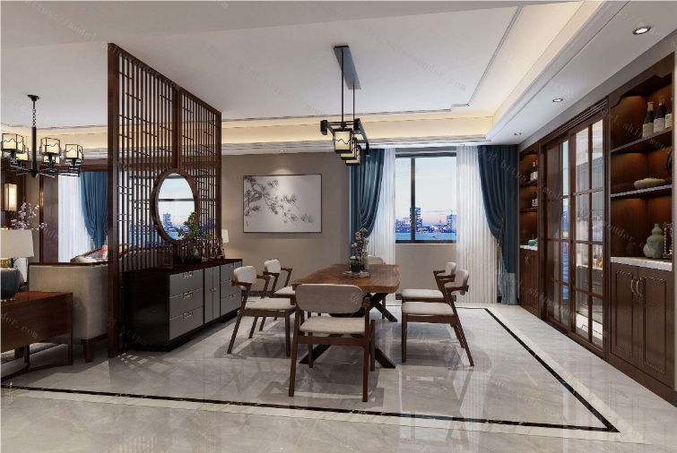 新中式室内设计风格注重整体的统一、协调与对比,在变化与多样中求统一,在系统中包容多样,力求统一与变化的完美结合,力求多彩和谐的表现。建模的统一完整性、材料、色彩等方面都可以体现出来,并在此基础上通过一些元素的变化来实现“和而不同”避免过度统一造成的单调、死板。