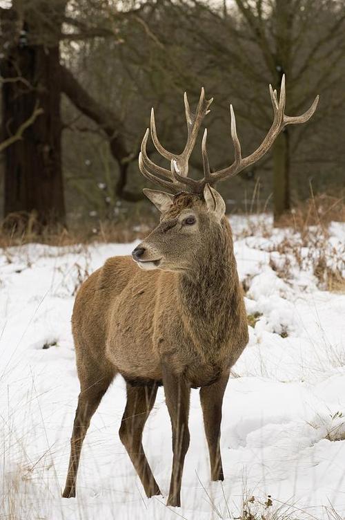 欧洲马鹿,学名Cervus elaphus,是一种在欧洲广泛分布的大型鹿科动物。该物种具有显著的性别差异,雄鹿体型显著大于雌鹿。成年雄鹿的平均体长为180至210厘米,而雌鹿则为160至195厘米。夏季,欧洲马鹿的毛色为典型的锈红色,冬季则转变为棕色。它们的体态修长,尾巴短小。最为突出的特征是雄鹿的鹿角,分叉众多,成熟个体的末枝分叉呈冠状。
