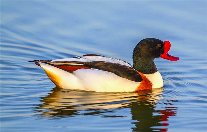 翘鼻麻鸭,学名为Tadorna tadorna,又称白鸭、掘穴鸭、花凫等,属于鸭科麻鸭属的鸟类。雄鸟体型较大,体长在54.3至63厘米之间,体重介于0.5至1.3千克;雌鸟体型相对较小,体长为52至59厘米,体重在0.62至1.2千克。该鸟类的虹膜呈棕褐色或褐色,喙部为赤红色或紫红色,脚部皮肤呈肉红色或粉红色。雄鸟的喙部赤红色且向上翘,在繁殖季节,上喙基部会出现一个红色的皮质瘤。头部和上颈部为黑色,并带有绿色光泽。背部至胸部有一宽阔的栗色环带;腹部中央有一条宽大的黑色纵带,从栗色环带延伸至肛门周围。肩羽和尾羽末端为黑色,其他体羽为白色。雌鸟的羽色较为浅淡,前额有一个小白斑,喙部无皮质瘤,头部和颈部不具备绿色金属光泽,栗色环带较窄且颜色较浅,腹部黑色纵带不够清晰。