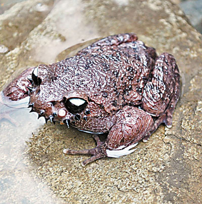 哀牢髭蟾,学名Vibrissaphora ailaonica,因其雄性个体上唇缘的角刺而俗称毛胡子或胡子蛙。此物种最早在我国的云南省哀牢山被发现,因而得名。属于角蟾科髭蟾属的两栖动物,体型较大,雄性个体体长在69至88毫米之间,雌性则在67至79毫米。雄性个体上唇缘有20至48枚不规则的锥形大黑刺。其体背颜色为灰紫色或灰紫棕色,带有黑色斑纹;腹面为乳白色,亦伴有黑斑。头部宽阔扁平,眼睛较大,前肢较长,后肢较短。