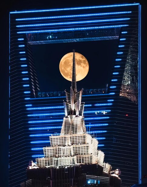 “环金穿月”景象的形成,是天文现象与城市建筑巧妙结合的产物。在特定的时间和角度下,满月沿着既定的轨道运行,当它恰好运行至上海环球金融中心顶部位置时,便会出现一种独特的视觉效果。此时,从合适的观测点望去,空中会呈现出“月亮、环球金融中心、金茂塔尖”三位一体的罕见景象。环球金融中心那高耸入云的建筑轮廓,在月光的映照下显得格外雄伟壮观;而金茂塔尖则如同一位优雅的守护者,与环球金融中心相互映衬;满月则宛如一颗璀璨的明珠,镶嵌在这两者之间,构成了一幅美轮美奂的画卷。这种景象的形成,不仅需要精确的天文计算和时间把控,还需要合适的地理位置和天气条件。只有在天气晴朗、能见度高的夜晚,观测者才能清晰地看到这一奇景的全貌。