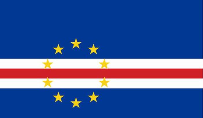 佛得角国旗启用于1992年9月22日。国旗呈长方形,长宽之比约为3:2。旗地为蓝色,在中部偏下有白、红、白三条色带横贯旗面,左下方有十颗黄色五角星构成圆环。蓝色象征海洋和天空,白色象征希望和平,红色象征人民的努力,条带象征佛得角人民用勤劳的双手建设国家的道路,五角星圆环象征佛得角民族及其团结。