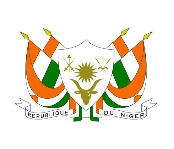 尼日尔国徽中央的绿色盾徽闪耀着太阳的光辉,尼日尔河两岸人民沉浸在它的光芒里,意气飞扬,向未来进发。后面左上角交叉的剑和矛,是当地撒哈拉游牧民族的标志,也是对历史上古老的尼日尔王国的纪念;右上角的玉米是尼日尔主要的粮食作物,代表人民赖以生存的农业;后面下部的牛头图案突出了以农牧业为主的特点。盾徽两侧迎风飘扬的国旗正召唤人民团结一致,迎接未来。盾牌底部的白色饰带上写有法文“尼日尔共和国”字样。