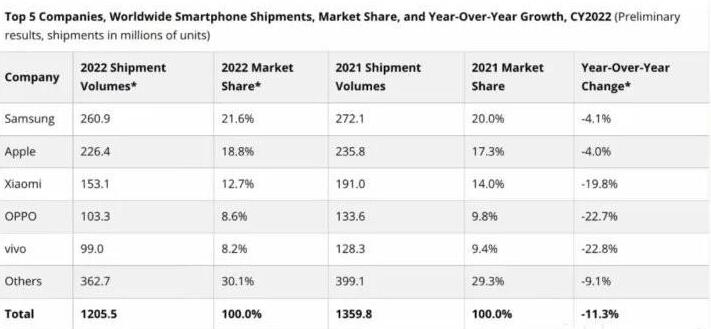 2022年,全球智能手机出货量达到12亿部,整体下降115%市场份额方面,三星上升了2%,苹果涨了2%,小米跌了1%,OPPO跌了2%,vivo下降了1%,其他的保持不变。对于智能手机制造商来说,这是不友好的一年。