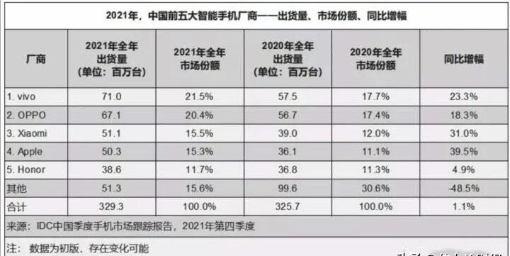 表1、2022年、IDC 2021年全球智能手机销量和份额数据。