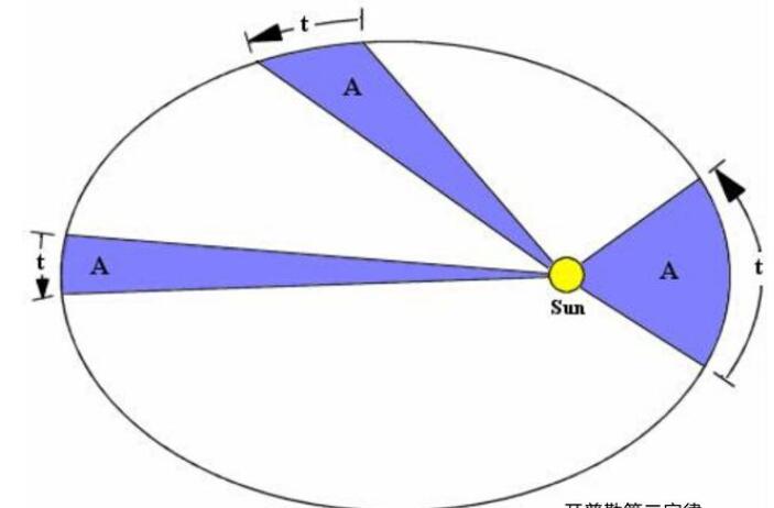 ,也称:在同一时间,太阳和移动的行星之间的连线扫过同一区域。这个定律实际上揭示了围绕太阳旋转的行星的角动量守恒。用公式表示为