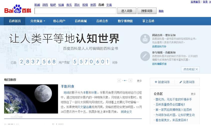 百度百科强调用户的参与和奉献精神,充分调动互联网用户的力量,汇聚上亿用户的头脑智慧,积极进行交流和分享。同时,百度百科实现与百度搜索、百度知道的结合,从不同的层次上满足用户对信息的需求。