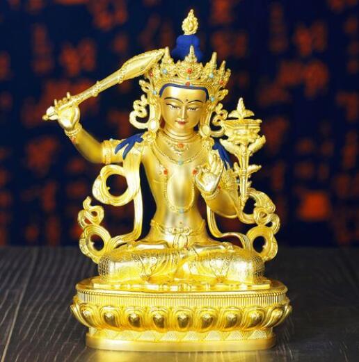 文殊菩萨,身紫金色,形如童子,五髻冠其顶,左手持青莲华,右手执宝剑,常骑狮子出入,既年青又威猛,却是过去现在未来无量菩萨的老师。《大乘心地观经》言:‘文殊师利大圣尊,十方诸佛以为母;一切如来初发心,皆因文殊教化力。’在《放钵经》中释尊曾言:‘我今得佛,是文殊师利之恩也。过去无央数佛,皆是文殊师利弟子,当来者亦是,其威神力所致。譬如世间小儿有父母,文殊者佛道中父母。’《菩萨处胎经·文殊身变化品》云:‘本为能仁师,今乃为弟子,佛道极广大,清净无增减,我欲现佛身,二尊不并立……’
