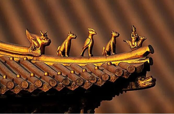 我国古建筑的屋顶通常采用木结构,易燃。屋顶的竖脊上经常雕刻着各种形象的小动物(脊兽)这些脊椎动物被赋予了神奇的力量,可以保护人类建筑中的健康和安全。