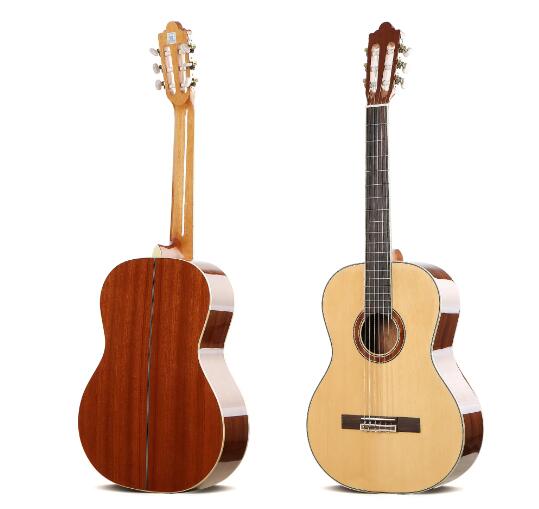 古典吉他的外观设计优雅美观,指板扁平略宽,扬声器厚实。它配有三根尼龙弦和三根金属缠绕弦(尼龙线是用细线缠绕的)这些弦横跨共鸣箱。指板和音箱连接处有12品,总共可以用19品。古典吉他的音孔是圆形的,下面没有挡板。面板和底板都是平的。古典吉他是吉他家族中最有艺术感的、适用范围最广、最有深度、最广为人知的吉他类型。古典吉他是一种独奏乐器、合奏、重奏、协奏曲是一种著名的乐器,它既有钢琴的雄浑,又有小提琴的优雅和灵巧“乐器王子”之称。