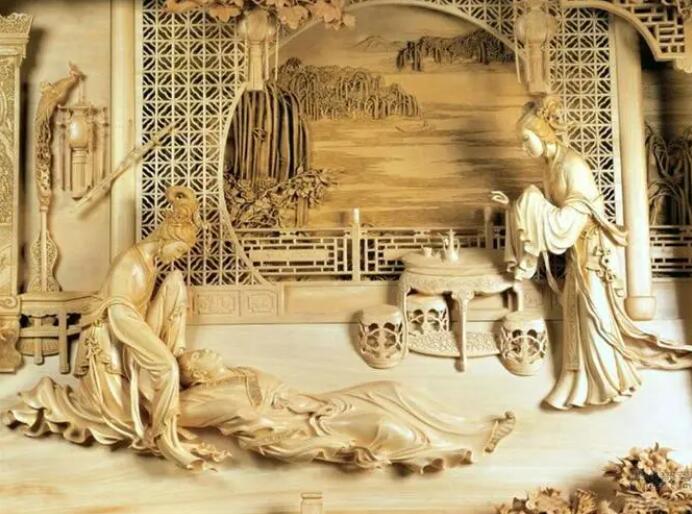 多层雕刻是指在平面浮雕的基础上,综合运用平面浮鞋、半圆能、圆雕和其他雕刻方法,使用分单元(组)雕刻、分层对接装配的创新技术。多层雕刻首先将画面分解成工作单元(组)分单元(组)雕然后将其底(远)景观组在尺度上横向排列固定在另一个网格上,中近景单元的图案以单边固定的方式插入组合到底(在视觉之上,在一个平面上形成由近及远由低及高的多层次画面,达到在平面背景上立体的艺术效果。