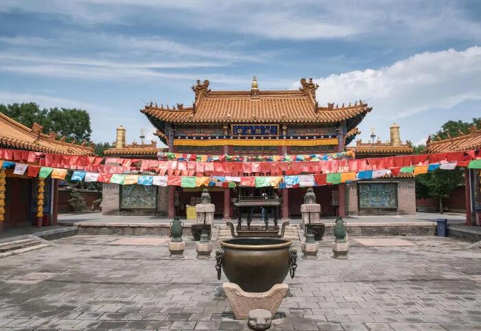 大召寺占地面积近3万平方米,建筑面积8000多平方米。大钊的布局是汉庙的形式,大厅被称为唐菁、佛殿相连,统称“大殿”前厅分为两层三开间,后厅、佛寺四周,佛寺正中有一尊银佛像,高2米.55米处,龙盘踞在前方的天柱中,宗喀巴和达赖喇嘛三世都在身边、四世铜像陪伴着他;在大召寺大门的屋檐下“九边第一泉”匾额高悬。大召寺最经典的是“伽蓝七堂制”伽蓝是这座寺庙的别称大召寺坐北朝南,七殿也指山门、钟楼、鼓楼、天王殿、东配殿、西配殿和正殿由南向北分布。大召寺有很多佛教活动,其中最重要的是悬佛、跳恰木、送巴陵有三大令,是藏传佛教特有的佛教活动。