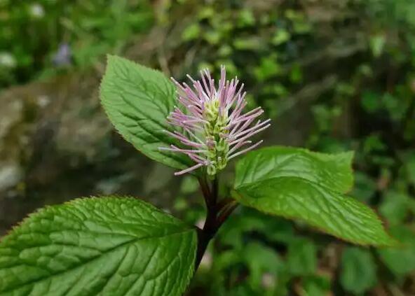 叶互生,长2-3厘米,先端渐尖,基部楔形,全缘,边缘具浅锯齿,背面浅绿色,有长柔毛。花两性,花梗短,花萼5枚,裂片披针形,全缘或长圆形,上面被柔毛,下面被稀疏柔毛;花药长椭圆形,长3-5毫米,厚4-6毫米,先端钝,边缘具细齿,背面被稀疏柔毛,背面被柔毛;雄蕊长圆锥花序轴短而下垂;雌蕊长圆锥花序轴短而下垂状或稍长状椭圆形、倒卵形或者倒长圆锥形,萼片3枚,花瓣线形,红色至深红色;雄蕊近无毛或有长的粗而短的蜡质花丝。花药长圆锥状圆柱形,萼片基部具厚唇状突起,边缘具细而尖锐齿。花梗1枚直立或斜生于小叶轮叶脉之间;雄蕊多数;花药1-2瓣丛生于大叶轮叶背上;雄蕊单生或3枚,柱头3裂;子房下位4室无毛或疏被柔毛。花期5-6月。