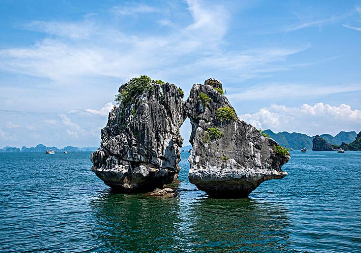 下龙湾因其典型的喀斯特地貌形成了许多独特的石头、洞穴和岛屿,以香炉石为景点、斗鸡石、人头石、惊讶洞、天宫洞、天堂岛、巡州岛、基托夫岛、吉婆岛国家公园。