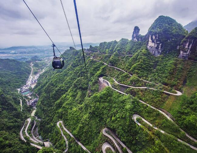 天门山索道是世界上最长的单线循环高山客运索道、 是国内少有的高差超过1000米的索道也是目前国内局部坡度最大支架最多的索道。