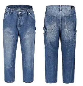 牛仔裤又称“坚固呢裤”,原美国西部早期垦拓者(牛仔)穿着的工装裤子,一般用纯棉、棉纤维为主混纺、交织的色织牛仔布制作,现作为一种男女穿用的紧身便裤。蓝色粗斜纹布厚裤子,在张力点上用铜铆钉加固,裤腿紧裹在腿上。前身裤片无裥,后身裤片无省,门里襟装拉链,前身裤片左右各设有一只斜袋,后片有尖形贴腰的两个贴袋,袋口接缝处钉有金属铆钉并压有明线装饰。具有耐磨、耐脏,穿着贴身、舒适等特点。